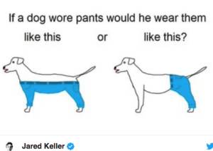 También se puede describir así a otro debate que dividió a internet y que recuerda bastante a este: cómo llevaría un perro unos pantalones. El autor del vídeo de la barra de pan cree que en las cuatro patas, no solo en las dos traseras, "ya que el objetivo de los pantalones es cubrir las piernas".