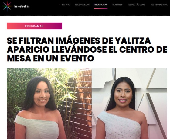Pero la sátira no se ha limitado al aspecto de Aparicio. El fin de semana se dio a conocer una publicación desde el sitio web de Las Estrellas, el canal donde se transmite La Parodia y que pertenece a Grupo Televisa. “Se filtran imágenes de Yalitza Aparicio llevándose el centro de mesa de un evento”. Aunque la dirección url aún existe, el contenido de la página ha sido borrado.