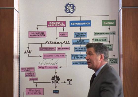 Empecemos por Jack Donaghy. 30 Rock es una serie creada por Tina Fey, que interpreta a Liz Lemon, la directora de un programa de humor en directo al estilo del Saturday Night Life. Donaghy, interpretado por Alec Baldwin, es el clásico ejecutivo obsesionado por trepar en el escalafón. Un escalafón especialmente absurdo: NBC es propiedad de una empresa de pelucas, a su vez propiedad de una empresa de microondas, a su vez propiedad de General Electrics.