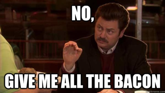 "Dame todo el bacon y los huevos que tengas… Espera, espera… Estoy preocupado por si has entendido que quiero un montón de bacon y huevos. Lo que he dicho es que me des todo el bacon y los huevos que tengas".