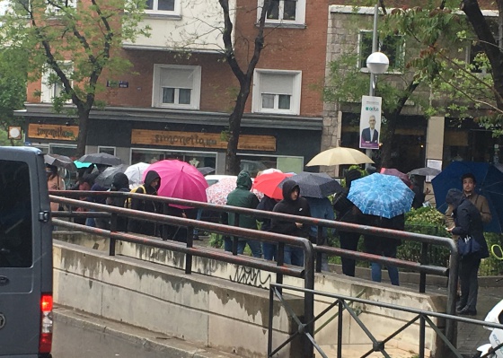 10. Si te toca esperar en la calle, aprovecha cada portal o balcón. En la oficina de Guzmán el Bueno, la mayoría de los que hacen cola coinciden que lo peor es “el codo”, el punto de la acera alejado de cualquier edificio donde la cola gira. “Una vez que pasas esa zona, lo mejor es apretarse un poco aprovechando cualquier balcón o cochera, que hay que darle descanso al paraguas”, cuenta un grupo de chicas que se han conocido en la cola.