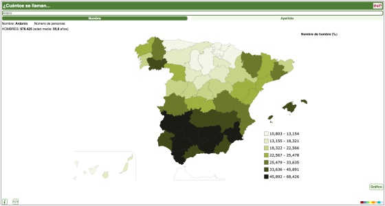 - Da datos de dónde es más frecuente un nombre, cuántas personas lo tienen y cuál es su edad media. Hacemos la prueba con Antonio: en total, hay 678.425 en España, su media de edad es 55,9 años y se concentran, sobre todo, en Extremadura. Puedes hacer clic en las imágenes para ampliar.