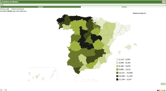 Para el nombre de mujeres, probamos con Lucía: vemos que hay 202.562, con una media de edad de 23,2 años. Las hay, sobre todo, en las provincias aledañas a Madrid (Valladolid, Ávila, Toledo, Guadalajara…), Asturias y Cantabria.