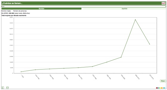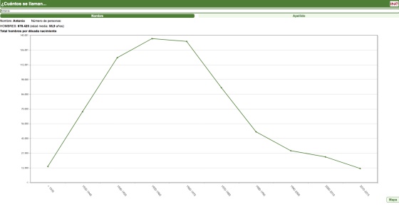 - Muestra cómo ha evolucionado un nombre a lo largo del tiempo. Permite ver si el número de personas a las que se ha puesto el nombre consultado, por década de nacimiento, para comprobar si el nombre va a más o a menos. Se consulta en el botón “gráfico” (abajo, a la derecha) y no está disponible para los apellidos. El número de jóvenes que se llaman Antonio, por ejemplo, es ahora mucho menor: entre 2000 y 2010 “solo” pusieron Antonio a 24.352 personas. Entre 1950 y 1960 fueron 136.748.