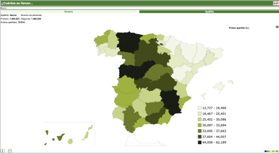 - Refiere cuántas personas compartes apellido y dónde están. Esta herramienta no permite buscar por nombre y apellido a la vez ni ver las gráficas de la evolución de los apellidos, así que no podemos mirar cuántos Antonio García hay, por ejemplo. Pero sí se puede saber cuántas personas comparten un apellido. Y además, cuántos lo tienen de primer apellido (1.464.633 en el caso de los García), cuántos lo tienen en segundo lugar (1.482.003) y cuántos se apellidan García García (78.914).