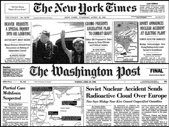 El 29 de abril, The New York Times lo contaba así: "Los soviéticos anuncian un accidente nuclear en una planta eléctrica". The Washington Post daba más gravedad al problema: "El accidente nuclear soviético lanza una nube radioactiva sobre Europa".