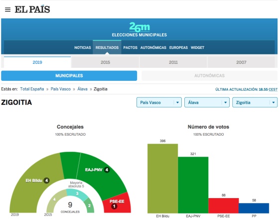 Otros de los gráficos también omiten información. Por ejemplo, que algunos de sus pactos con PNV en el País Vasco son la alternativa a mantenerlos con Bildu, como en Zigoitia (Álava). La tarta electoral de Ciudadanos marca los cuatro escaños de Bildu en gris, en vez de representarlos con su color habitual (verde claro) como hace con el resto de partidos. También omite el nombre del partido mientras que sí incluye los del PSOE y PNV. Las correcciones publicadas por el presentador de televisión Quique Peinado han sido de las más difundidas en la red social, como en el caso de Zigoitia.