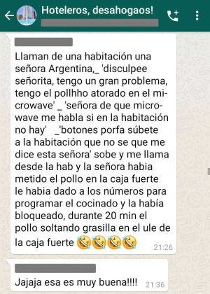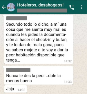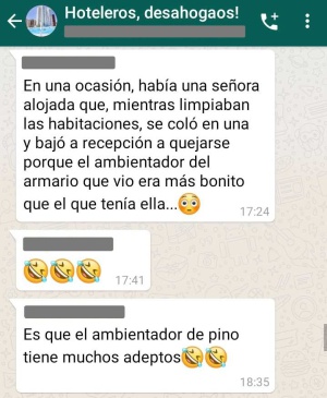 Hemos creado un grupo de WhatsApp con 18 trabajadores de hoteles para que se desahoguen, igual que hicimos con camareros, tatuadores, enfermeras o libreros. Son de varias comunidades autónomas distintas. Y de diferentes edades. Además, están representados varios puestos de trabajo de un hotel. Desde el dueño al botones, pasando por kellys, recepcionistas y camareros. Esto es lo que más les molesta que hagamos cuando visitamos sus establecimientos.