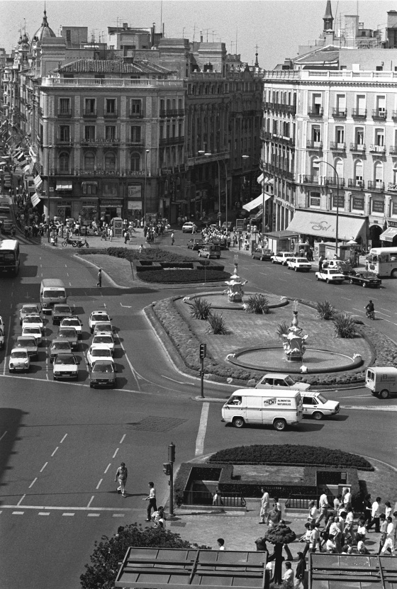 En los años 80, la Puerta del Sol seguía sin ser peatonal, pero ya dedicaba más espacio a los viandantes. El tráfico se escoraba hacia la Real Casa de Correos. Cada sentido de la circulación estaba separado por cuatro farolas que, originalmente, tenían unos apliques que los madrileños bautizaron como supositorios. El Ayuntamiento los terminó retirando.