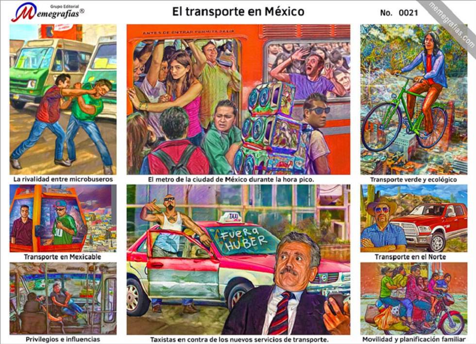 La rivalidad de los microbuses. Según cifras del INEGI, diariamente se realizan 15,7 millones de viajes en transporte público. De ellos, 3 de 4 viajes se realiza en microbús o combi. Al ser el medio de transporte público más usado, no es raro ver peleas a golpes entre conductores por ganar el pasaje. “La viñeta de los choferes peleando está inspirada en muchos videos de youtube donde personas graban ese tipo de situaciones”, dice Moyado, autor de Memegrafías.