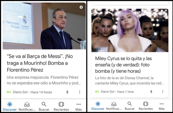 Diario Gol y otras páginas parecidas enrevesan a propósito los titulares para obligar al lector a pinchar al ver las noticias en Discover. Además de Diario Gol, otras páginas usan esta fórmula. Esta técnica va más allá del clickbait: no solo oculta parte de la información en el titular para que el lector haga click, sino que la redacción de muchos de sus titulares da a entender algo diferente. Juegan con la posibilidad de que los lectores interpreten algo completamente distinto, mucho más atractivo que la realidad. El cuerpo de la noticia sí explica la noticia, pero el titular, el subtítulo y la fotografía intentan engañar. Y muchas personas no pinchan en las noticias, se informan a base de titulares. Consumen información echando un vistazo a las recomendaciones de Google o navegando por redes sociales.