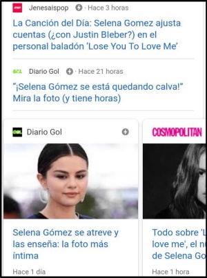 Titulares como los de Diario Gol y otros medios parecidos no solo gozan de buena visibilidad en Discover. También están bien muy bien posicionados en las búsquedas de Google por palabras clave. Hacemos la prueba buscando el nombre de Selena Gómez, trending topic este 23 de octubre. Cerramos nuestra sesión de Google antes de hacer la búsqueda y navegamos en privado, para que no afecten nuestras consultas anteriores. Diario Gol aparece entre los primeros resultados, de nuevo con titulares que intentan engañar al lector. El resultado Selena se atreve y las enseña: su foto más íntima es un artículo sobre varias fotografías de su Instagram, una de ellas de la cantante cuando era niña.