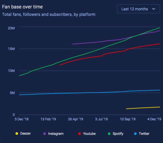 Y su ascenso parece que no ha tocado techo. En el último año (desde diciembre de 2018), el estadounidense ha doblado sus seguidores en Spotify, según la herramienta Soundcharts: de 8,9 millones a 19,7 millones de fans en esta plataforma a diciembre de 2019. Es el equivalente a la población de Chile o de Rumanía.