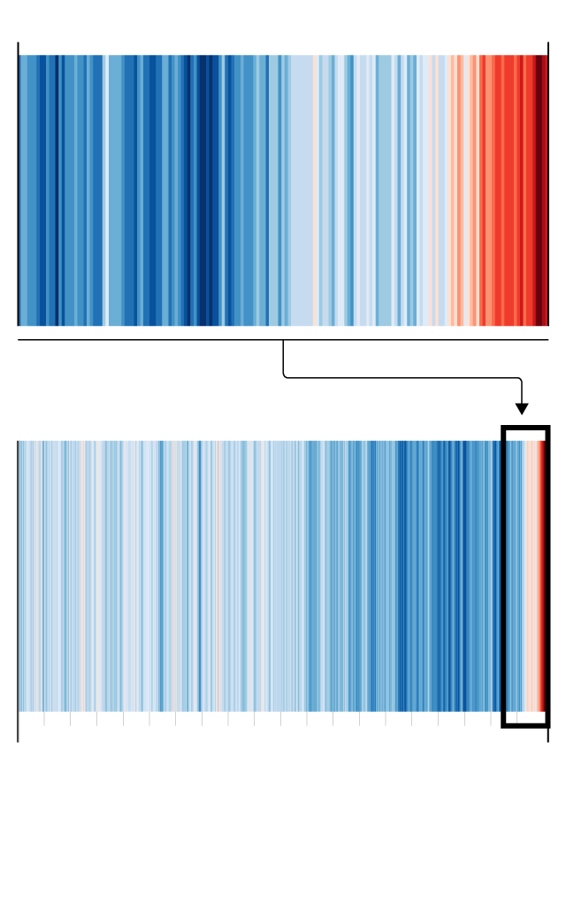 El proyecto Show your stripes, "muestra tus barras", mostraba gráficos que reflejaban la evolución de la temperatura global o por países desde 1901. Este trabajo de Ed Hawkins, profesor de Ciencias Climáticas en la Universidad de Reading, Reino Unido, se compartió en redes sociales y se explicó y se publicó en medios de comunicación de todo el mundo, inspirando prendas de ropa, portadas de revistas e instalaciones callejeras. Ahora Hawkins ha ampliado este gráfico para mostrar la evolución de las temperaturas globales de los últimos 2019 años.