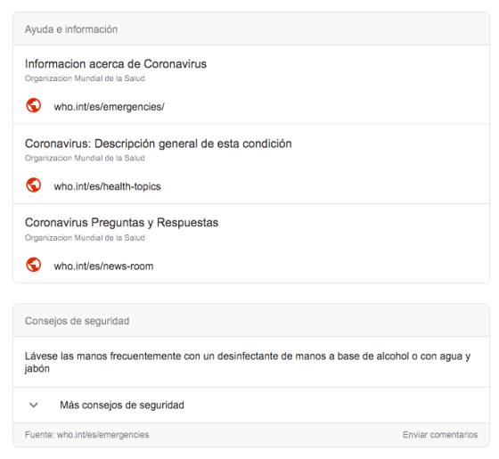 Uno de los sitios donde más información estamos buscando sobre esta enfermedad es Google, como ya apuntábamos en otro artículo en el que respondíamos a algunas de las dudas más frecuentes, como si son necesarias las mascarillas para la población en general (no lo son). Al escribir “coronavirus” en el buscador, aparece desde hace unas semanas lo que en la empresa llaman knowledge panels (paneles de conocimiento). En este caso, son dos: un recuadro con enlaces a información sobre el virus y otro con consejos de seguridad, en ambos casos de la OMS. Entre estos consejos están los de lavarse las manos frecuentemente y cubrirnos al toser o estornudar.