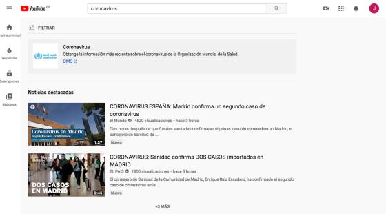 Las búsquedas en YouTube, propiedad de Google, dan un resultado similar: primero aparece un enlace a la OMS y, según nos explica una portavoz de la empresa, en los resultados tienen prioridad los vídeos de fuentes verificadas. Además, los contenidos sospechosos de difundir información poco fiable aparecen menos en resultados y recomendaciones, pudiendo llegar a eliminarse en casos extremos. Estos vídeos se identifican gracias a denuncias de otros usuarios y al algoritmo de la plataforma.