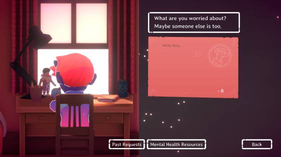 Hay videojuegos que también crean su propia comunidad, al margen de la existente en torno a Wholesome Game. Por ejemplo, el videojuego Kind Words (lo fi chill beats to write to), de PopCannibal, precisamente ludifica el poder de los usuarios creando redes de apoyo. En este wholesome game somos un alter ego dentro de una relajante habitación desde donde podemos enviar y recibir cartas de otros jugadores. Por tanto, la mecánica principal del título es escribir cartas, ya sean palabras de ánimo o de desahogo, pero en un espacio virtual con música relajante, colores suaves y mensajes positivos por parte de Ella, una cartera cierva que nos guía y nos hace compañía.