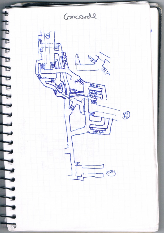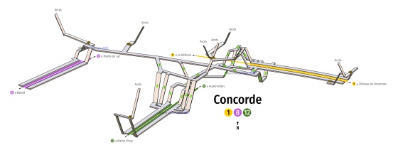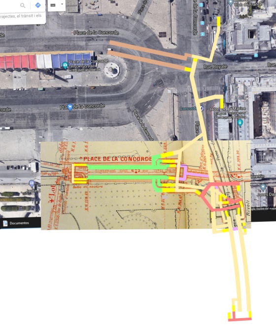 Con esta información, explica, pudo afinar las distancias y corregir errores de perspectiva, aunque advierte que cada plano tiene sus propias proporciones y unas estaciones no pueden compararse con otras. A continuación, puedes ver tres imágenes del proceso de creación de los mapas. "La primera imagen es el esbozo que saqué directamente paseándome por los pasillos de la estación de Concorde, en París, en 2014", explica Guillaumes. "La segunda, un trazado hecho con Inkscape [un editor gráfico] de lo dibujado en el paso 1, basándome en planos antiguos encontrados por internet y con fotos aéreas, para ajustar los pasillos con las bocas de metro. Y la tercera, el resultado final":