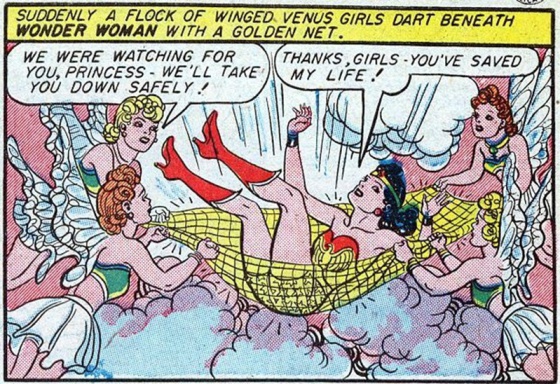 La interpretación más festiva y menos científica de la vida en este planeta se inspira en la diosa Venus y sus atributos: fertilidad, el amor, la belleza… En esta visión venusiana, el planeta está habitado solamente por mujeres, normalmente, guerreras amazonas con poderes. Una de las primeras interpretaciones gráficas de este Venus aparece en el número 12 del cómic Wonder Woman, en 1945. En él, la superheroína se encontraba con venusianas aladas cuya Reina transforma a malvados hombres fabricantes de armas en buenos ciudadanos que respetan la ley.