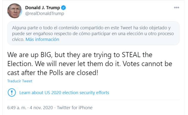 El presidente de Estados Unidos, Donald Trump, ha tuiteado a las 2.30, hora de Washington (8.30 hora peninsular española), un mensaje en el que decía que tenía ventaja en el recuento: “Están intentando ROBAR las elecciones. No dejaremos que lo hagan. ¡No se puede votar después del cierre de las urnas!”. Twitter marcó enseguida el tuit como potencialmente engañoso. Trump publicó un segundo mensaje avisando de que comparecería en las próximas horas para anunciar “una gran victoria”. [Puedes seguir la última hora de las elecciones estadounidenses en EL PAÍS].
