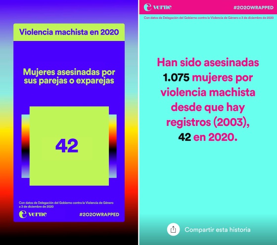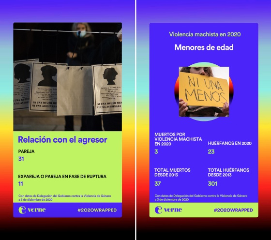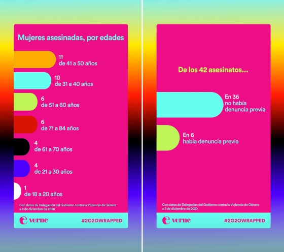 Aunque el resumen de Spotify es ya tradicional, este ha sido un año atípico, en el que nos hemos fijado más en otras cifras. Pese a que hemos pasado los últimos nueve meses pendientes de los datos diarios de contagios y fallecidos, hay algo que, por desgracia, no ha cambiado mucho a pesar de todo: las cifras de las asesinadas por violencia de género. Para no olvidarnos de ellas, este es el resumen de este año en cifras, realizado con los datos que ofrece la Delegación del Gobierno contra la Violencia de Género tanto de mujeres asesinadas como de menores víctimas mortales. (Puedes consultar más datos en estas infografías de EP Data). También puedes conocer sus historias, porque estas víctimas son más que un número: aquí las de las primeras cuarenta y las de las dos últimas víctimas, una en Sevilla y otra en Pontevedra este mismo miércoles.