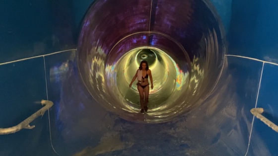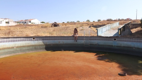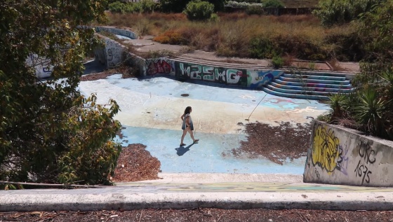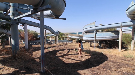 Frente al panel de fotografías de la exposición, una pantalla emite en bucle un vídeo grabado en los diferentes parques abandonados. En él puede verse a Leonor Martín (que interpretaba a Cova en Física o Química y, actualmente, a Dori en Acacias 38) actuando en los parques abandonados de la misma manera que lo haría en uno abierto: ilusionada a punto de lanzarse por un tobogán, sentándose en el borde de una piscina con los pies dentro, intentando refrescarse en las duchas, sentada en los toboganes… Todo a pesar de que, a su alrededor, no haya ni una gota de agua. Solo hierbajos secos. Al final del vídeo, la protagonista acaba bañándose en el mar. “Queríamos mostrar algo que pudimos ver nosotros, y que también nos contaron los expertos a los que entrevistamos, y es que muchos de estos parques han sido construidos al lado de entornos naturales donde ya hay agua”, cuenta por teléfono Martín. "¿Por qué estamos construyendo infraestructuras que replican fenómenos naturales, como las olas, justo al lado de la costa?”