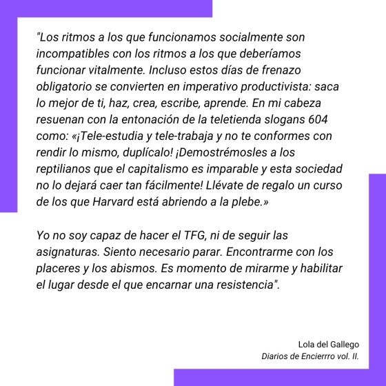 La convocatoria pedía algunos requisitos: “Aparte de las cuestiones técnicas de longitud y formato”, dice Hernández, “les pedíamos practicar la mirada íntima y enfocarse en uno o dos temas, en lugar de escribir acerca de absolutamente todo lo que les pasaba o veían. Por eso hay diarios centrados en el cuerpo, en la muerte, en la casa, en lxs otrxs... En general encontramos muchas similitudes en casi todos los diarios: sorpresa por lo que estaba pasando, miedos de muchos tipos (muertes familiares, precarización laboral, incluso vivir en la misma casa que tu agresor...)”.